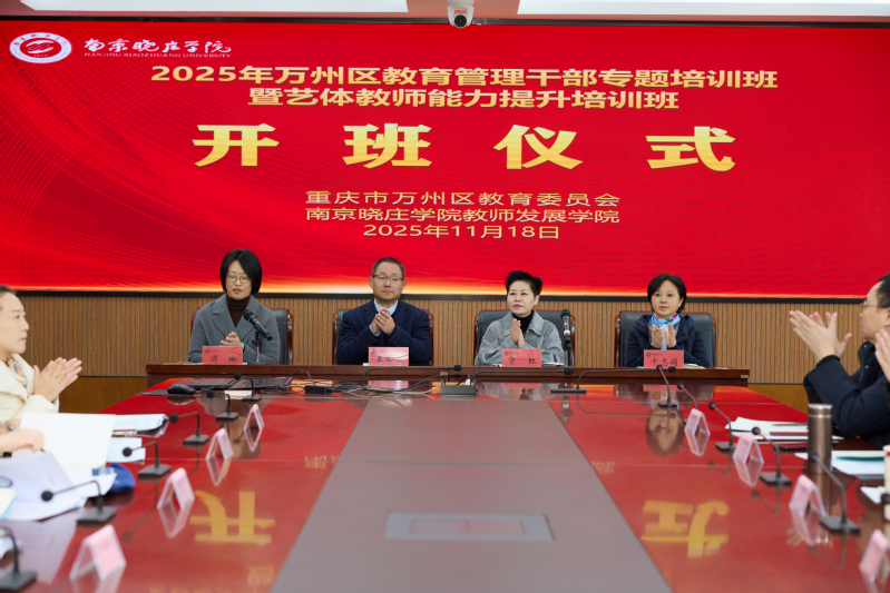11月18日,由重庆市万州区教育委员会、南京市教育局主办,南京晓庄学院承办的“2025年万州区教育管理干部专题暨艺体教师能力提升培训班”开班仪式在我校莫愁校区举行。重庆市万州区教师进修学院纪委书记贺红,我校副校长王本余出席,我校教师发展学院相关负责人,以及97名学员参加仪式。