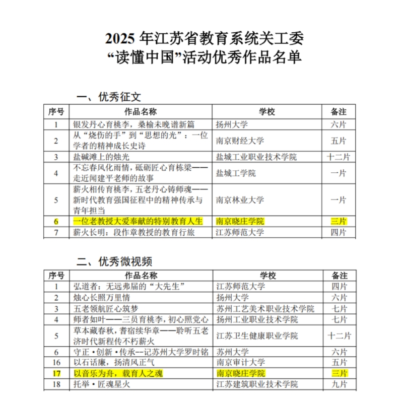 12月16日,省教育系统关工委发文公布2025年“读懂中国”活动入选作品名单,我校关工委选送的征文《一位老教授大爱奉献的特别教育人生》获评优秀征文奖、微视频作品《以音乐为舟,载育人之魂》获评优秀微视频奖。同时,我校关工委也获得教育部关工委2025年“读懂中国”活动表扬单位。