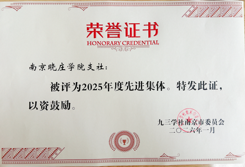 近日,九三学社南京市委员会公布2025年度先进集体与先进个人表彰决定,九三学社南京晓庄学院支社获评“2025年度先进集体”称号。支社成员肖晖、连茜、初滢滢、莫先武、王新建、胡欣等6名社员获评“2025年度先进个人”称号。
