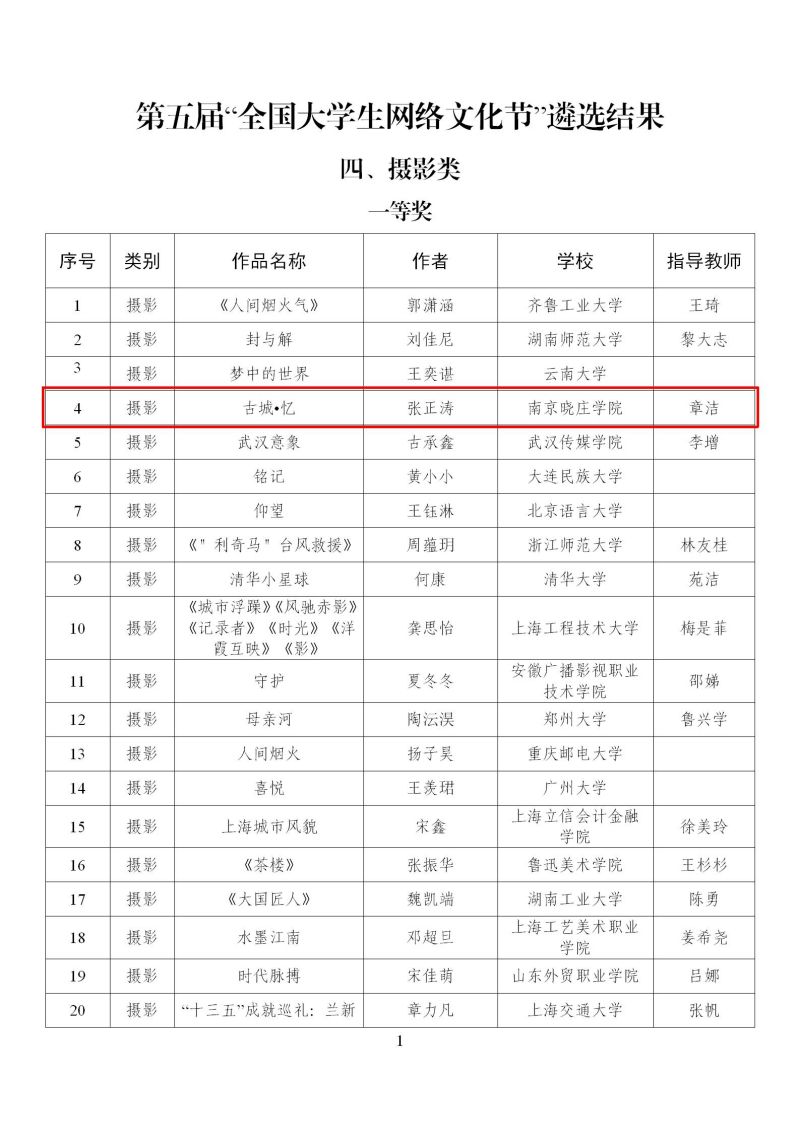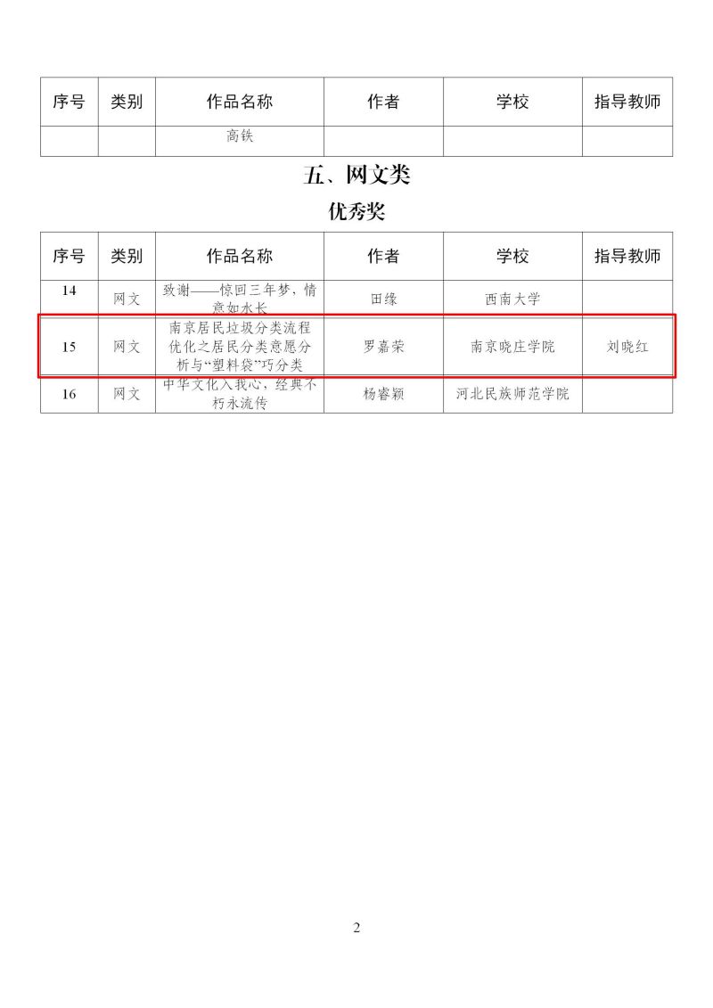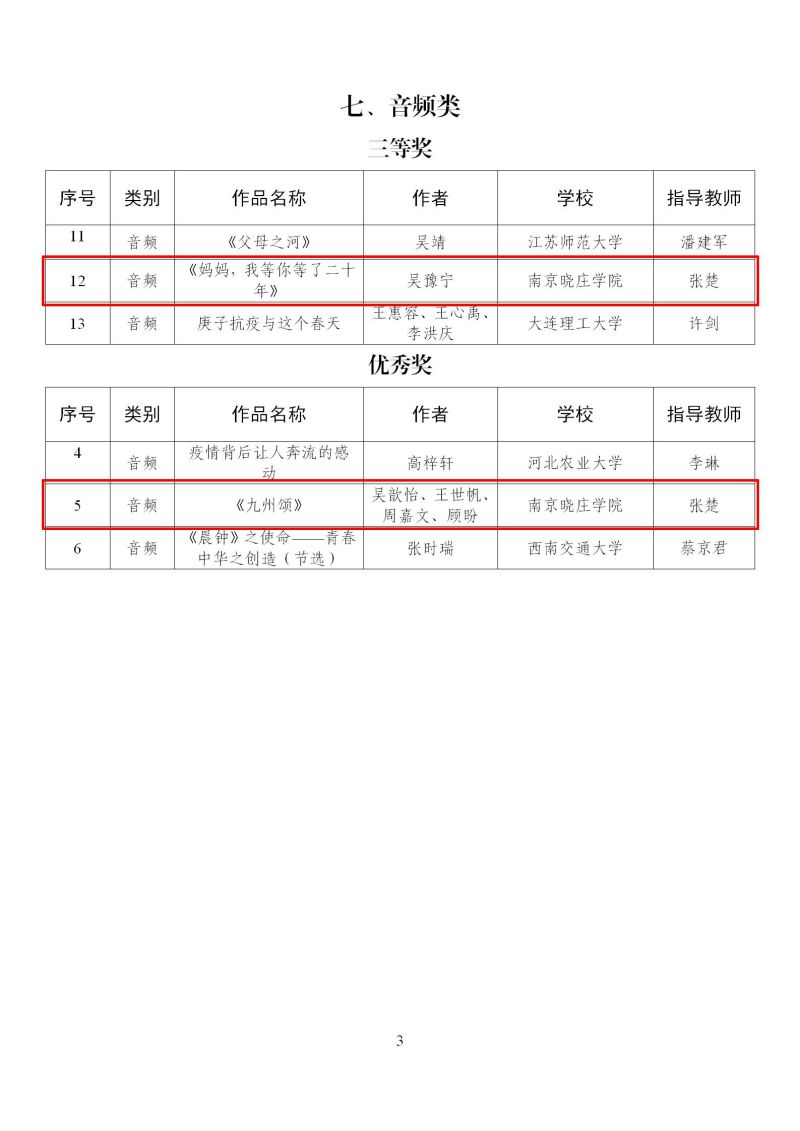 音乐学院张正涛作品《古城·忆》荣获摄影类一等奖,教师教育学院吴豫宁作品《妈妈,我等你等了二十年》荣获音频类三等奖,教师教育学院吴歆怡等作品《九州颂》和商学院罗嘉荣作品《南京居民垃圾分类流程优化之居民分类意愿分析与“塑料袋”巧分类》分别荣获音频类、网文类优秀奖。