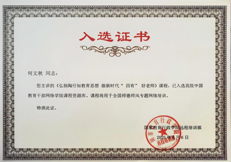 近日,我校陶行知纪念馆馆长何文秋主讲的“弘扬陶行知教育思想 做新时代四有好老师”专题网络课程,成功入选国家教育行政学院中国教育干部网络学院课程资源库。该课程将用于全国师德师风专题网络培训,面向全国教育工作者开放学习。