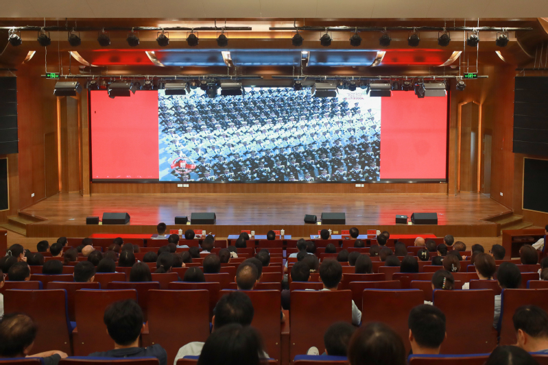 校领导和师生代表在主会场集中观看