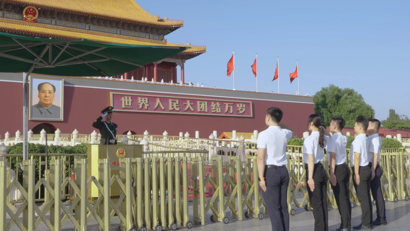 天安门广场武警官兵向学校退役军人师生代表回敬军礼