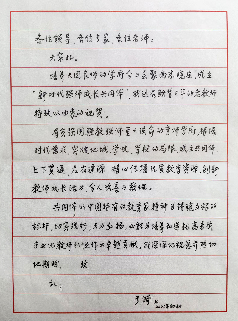 新时代强师成长共同体成立之际,中国教育学会名誉会长,国家教育咨询委员会委员、北京师范大学资深教授顾明远先生题字祝贺“新时代强师成长共同体启航”,期待共同体成员单位“弘道强师,同心致远”,期待共同体在今后的运行中“探教育规律,育良师队伍;聚群体智慧,谱教育新篇”;“人民教育家”于漪先生发来贺信,勉励“共同体以中国特有的教育家精神为铸魂立根的标杆,切实践行,大力弘扬,必能为培养和造就高素质专业化教师队伍作出卓越贡献。”