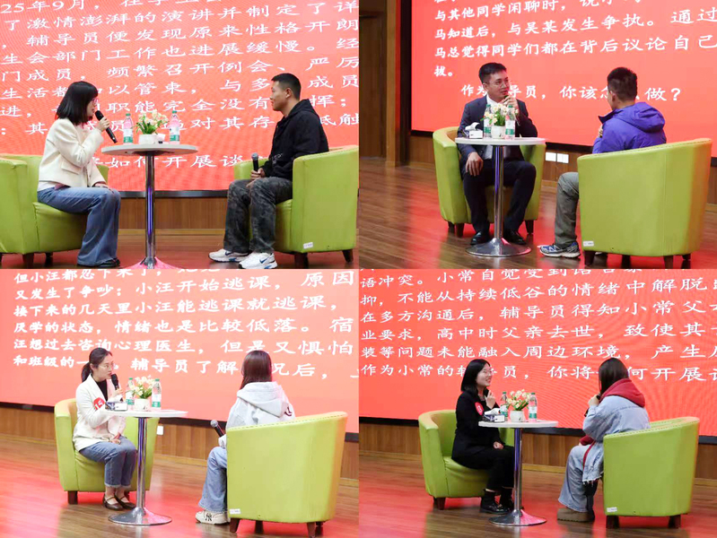 本届大赛分为初赛和决赛两个阶段。初赛包含理论测试、案例分析、理论宣讲三个环节:理论测试以学促考,案例分析考察辅导员解决、分析学生工作实际的能力,理论宣讲考察辅导员的思想政治理论素养。经过初赛角逐,20名辅导员成功入围决赛。决赛分为案例研讨、谈心谈话两个环节。案例研讨聚焦学生思想困惑、生涯规划、学业指导、心理健康等实际案例,参赛选手们沉着应变、思路敏捷,将理论与案例情景深度结合,精准把握问题核心,并给出行之有效的解决方案,充分展现了他们扎实的理论功底、出色的应急处理突发事件能力以及过硬的综合专业素养。谈心谈话聚焦人际交往、学业指导、就业规划、党团建设等多个领域。选手们专注倾听学生诉求,深入分析,循循善诱地化解学生的各种问题,对学生开展合理正向引导,充分展现了辅导员对学生的教育引导方面的专业能力以及解决理论困惑与实际问题的综合素养。这是一场以赛赋能的竞技盛会,更是一堂生动鲜活的“大思政课”,达到了“以赛促学、以赛代训、以赛促建”的办赛目标。
