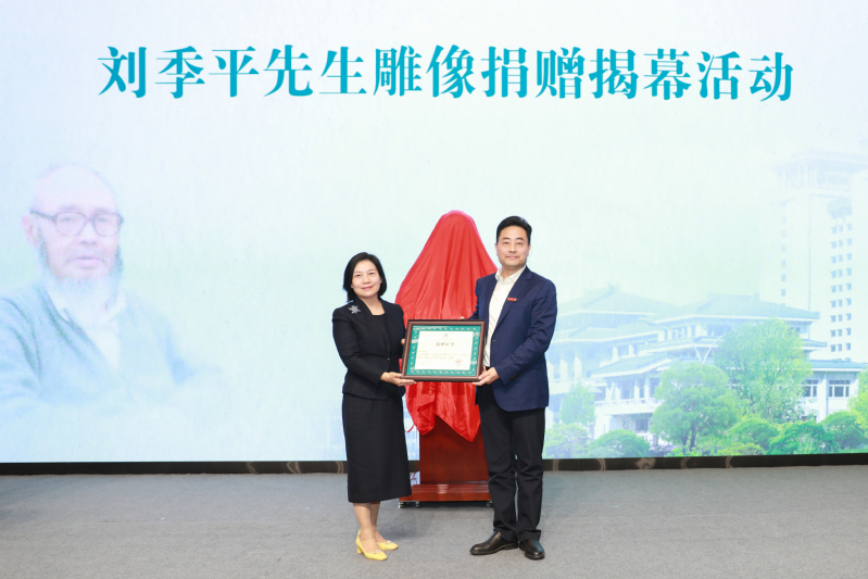 陈樱、张志华、王旭明、许士平共同为雕像揭幕。覆盖在雕像上的红色帷布徐徐揭开,一尊形神兼备的刘季平先生雕像呈现在众人面前,雕像栩栩如生地刻画了先生睿智慈祥的面容,表现了先生儒雅从容的气度。