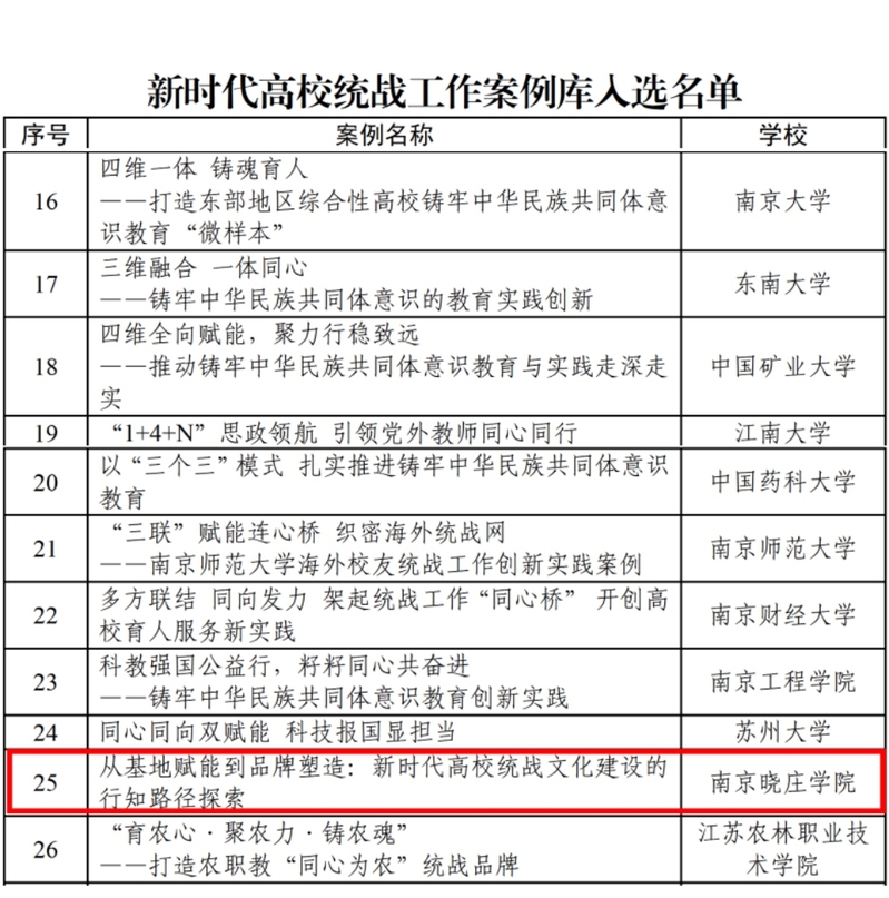 近日,由教育部思想政治工作司指导、中国高等教育学会统战工作研究分会组织的“新时代高校统战工作创新案例征集活动”评选结果公布,全国共60个案例入选。我校报送的案例《从基地赋能到品牌塑造:新时代高校统战文化建设的行知路径探索》成功入选。这是我校在统战工作领域取得的新突破,充分彰显了学校统战工作的创新探索与显著成效。