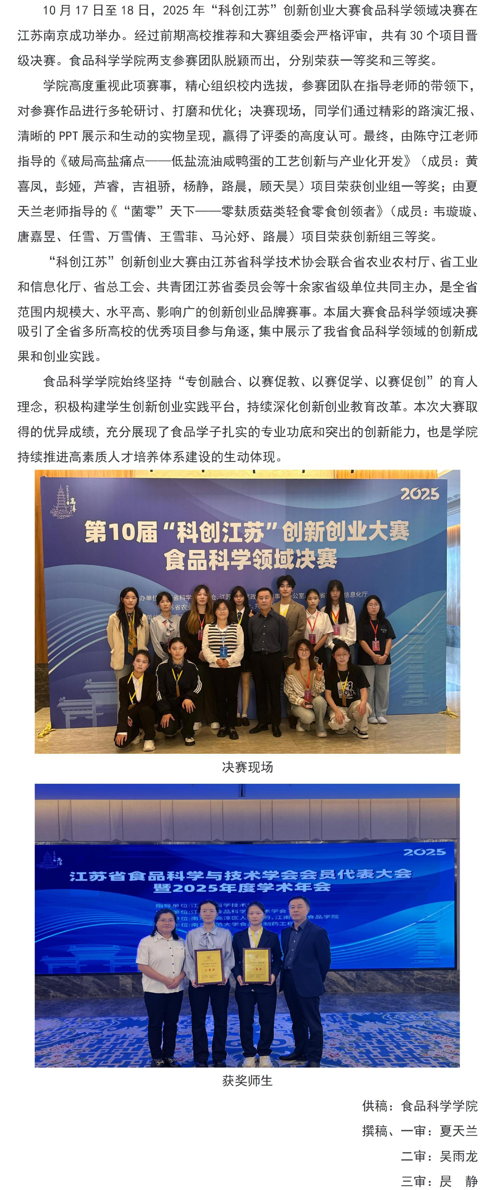 食科院学子在2025年“科创江苏”创新创业大赛中取得佳绩