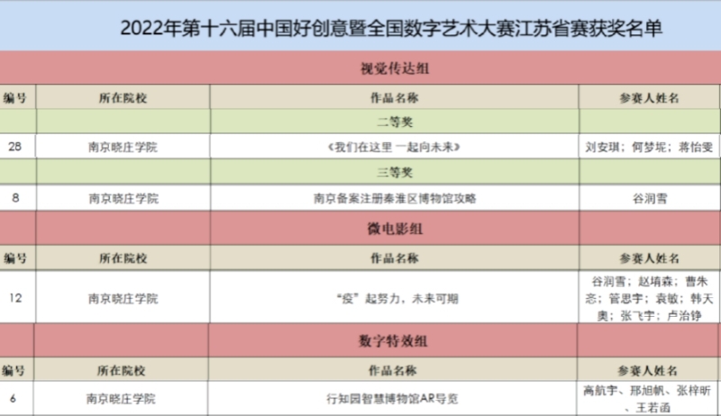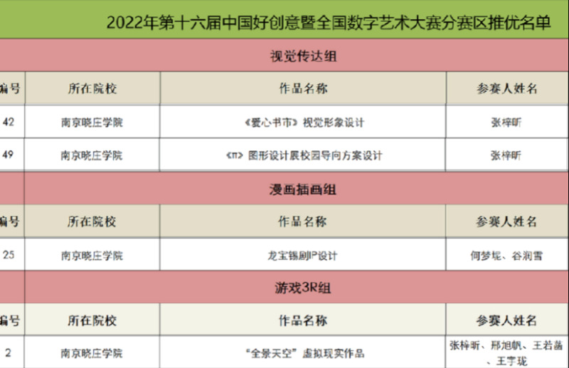 7月26日,第十六届中国好创意暨全国数字艺术设计大赛江苏省赛获奖名单正式发布。我校美院学生8件作品榜上有名,其中4件作品被推荐入围国赛,4件作品获得省级二等奖1项、三等奖3项。