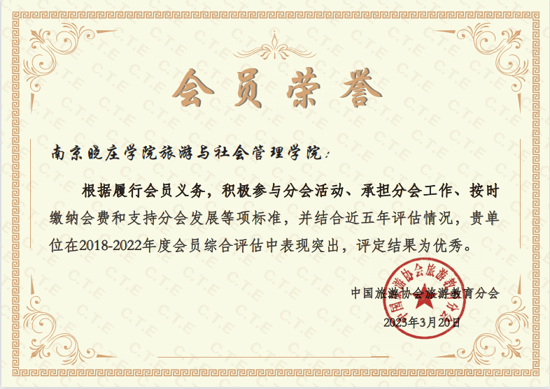 我校旅游与社会管理学院在2018—2022年度中国旅游协会旅游教育分会会员综合评估中表现突出,被评为优秀会员。