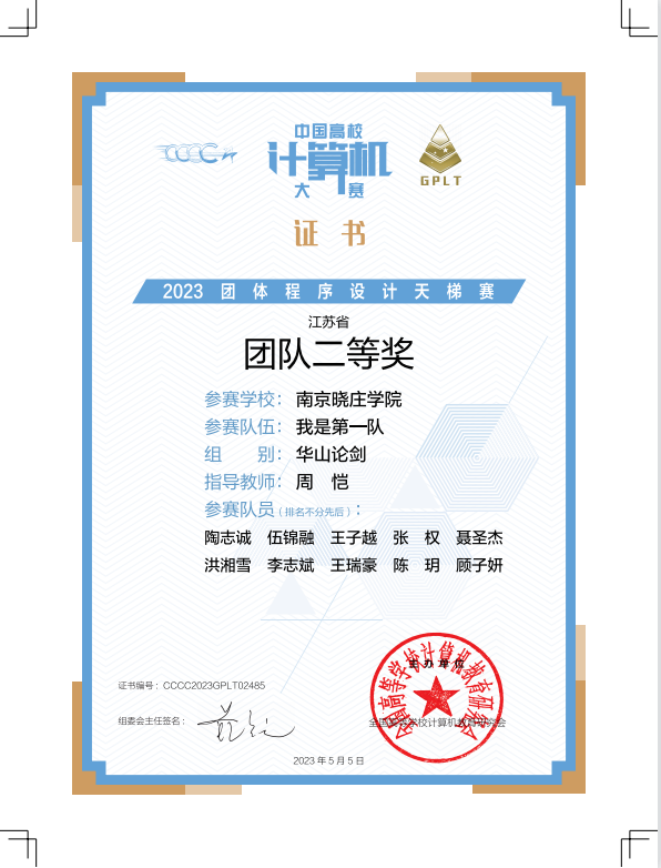 中国高校计算机大赛-团体程序设计天梯赛被中国高等教育学会列入《全国普通高校学科竞赛排行榜》,是我校一级竞赛。比赛分为基础题、进阶题和登顶题,由计算机自动测评。10人组成参赛队伍,每个成员独立完成各自的题目,通过团队总分角逐团队奖,每校取成绩最好的三支队伍合计总分角逐高校奖。天梯赛的考察面广、参赛人员多,能更好地反映出高校的人才培养基础和育人模式。