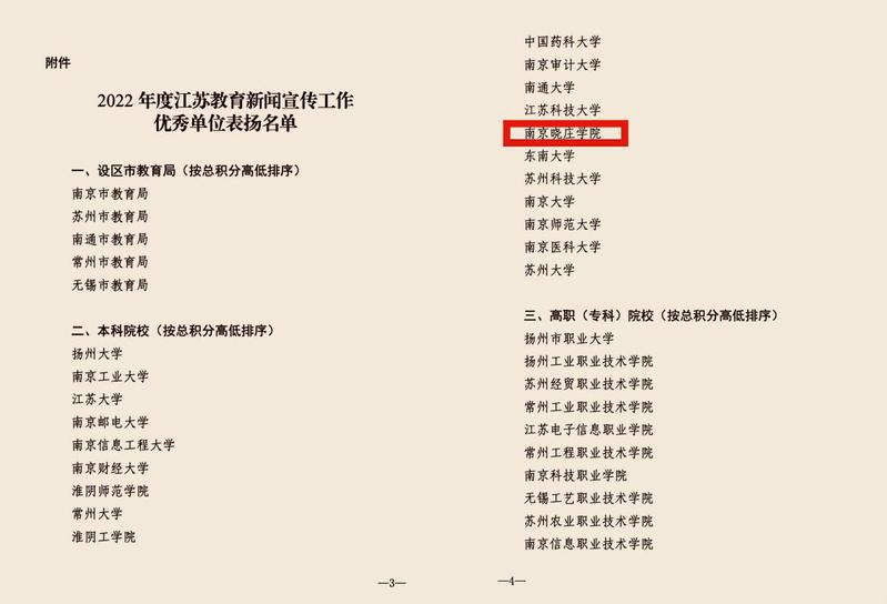 江苏省教育厅办公室(新闻办)近日公布2022年度全省教育新闻宣传工作优秀单位表扬名单。我校获评江苏教育新闻宣传工作优秀单位,总积分在全省本科高校中排名第十四。