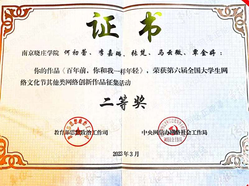 由教育部思想政治工作司、中央网信办网络社会工作局联合主办的第六届“全国大学生网络文化节”和“全国高校网络教育优秀作品推选展示活动”全国评选结果近日揭晓,新闻传播学院何初蕾、李嘉璐、张楚、马云微、覃金婷同学的作品《百年前,你和我一样年轻》(指导教师:马缘园)获得了网络创新作品类二等奖。