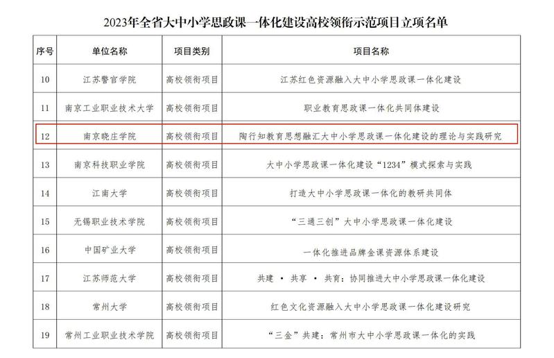 省教育厅近日公布2023 年全省大中小学思政课一体化建设示范项目立项情况。在高校领衔示范项目中,我校《陶行知教育思想融汇大中小学思政课一体化建设的理论与实践研究》获批立项。