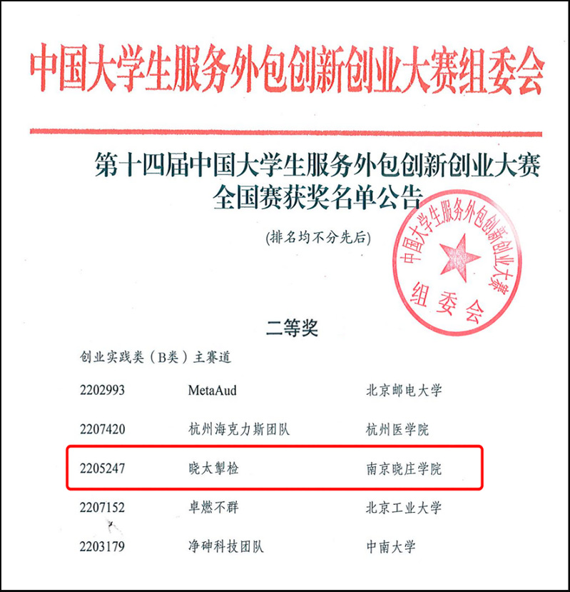 团队成员在激烈的竞争中凭借项目评审、现场答辩等环节中的优异表现,荣获东部赛区决赛一等奖,同时代表东部赛区参加全国总决赛,最终获得全国总决赛二等奖的优异成绩,展现了晓庄学子的风采。