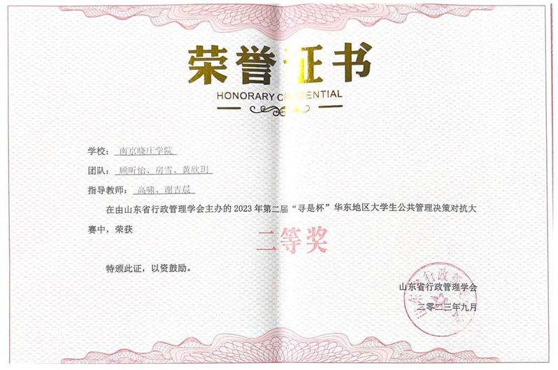 9月24日,第二届“寻是杯”华东地区大学生公共管理决策对抗大赛在齐鲁工业大学落下帷幕。由我校商学院教师高啸、谢吉晨指导,行政管理专业顾昕怡、房雪、黄欣玥等组成的团队获得二等奖。