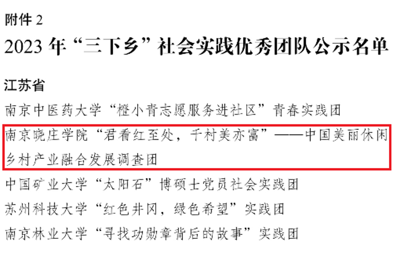 共青团中央近日通报2023年全国大中专学生志愿者暑期文化科技卫生“三下乡”社会实践活动情况,我校“君看红至处,千村美亦富”——中国美丽休闲乡村产业融合发展调查团获评2023 年“三下乡”社会实践优秀团队。