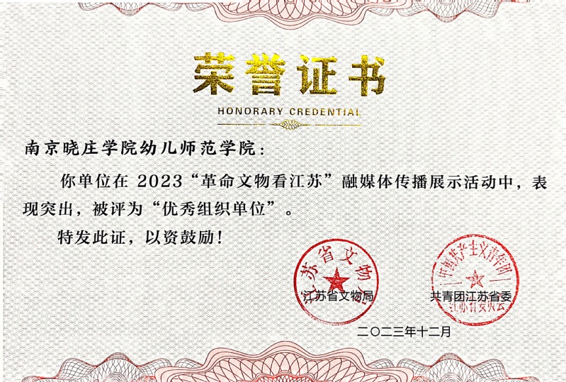 1月12日,2023“革命文物看江苏”融媒体传播集中展示活动在南京荔枝大剧院举行。活动现场对系列活动的获奖单位及选手进行了表彰,我校幼儿师范学院获评优秀组织单位。