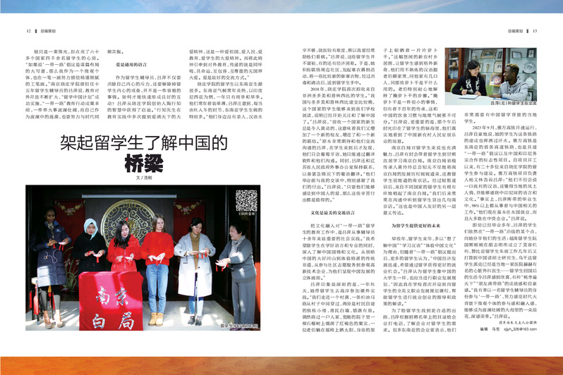 《莫愁》杂志 2023年12 月刊“总编策划”推出“‘一带一路’上的江苏故事”,专题报道了我校教师吕萍担任留学生辅导员 15 年中,将行知大爱精神、中华文化魅力、职业发展规划融入留学生教育中,以一束微光,点亮了六十多个国家四千余名留学生心房的故事。