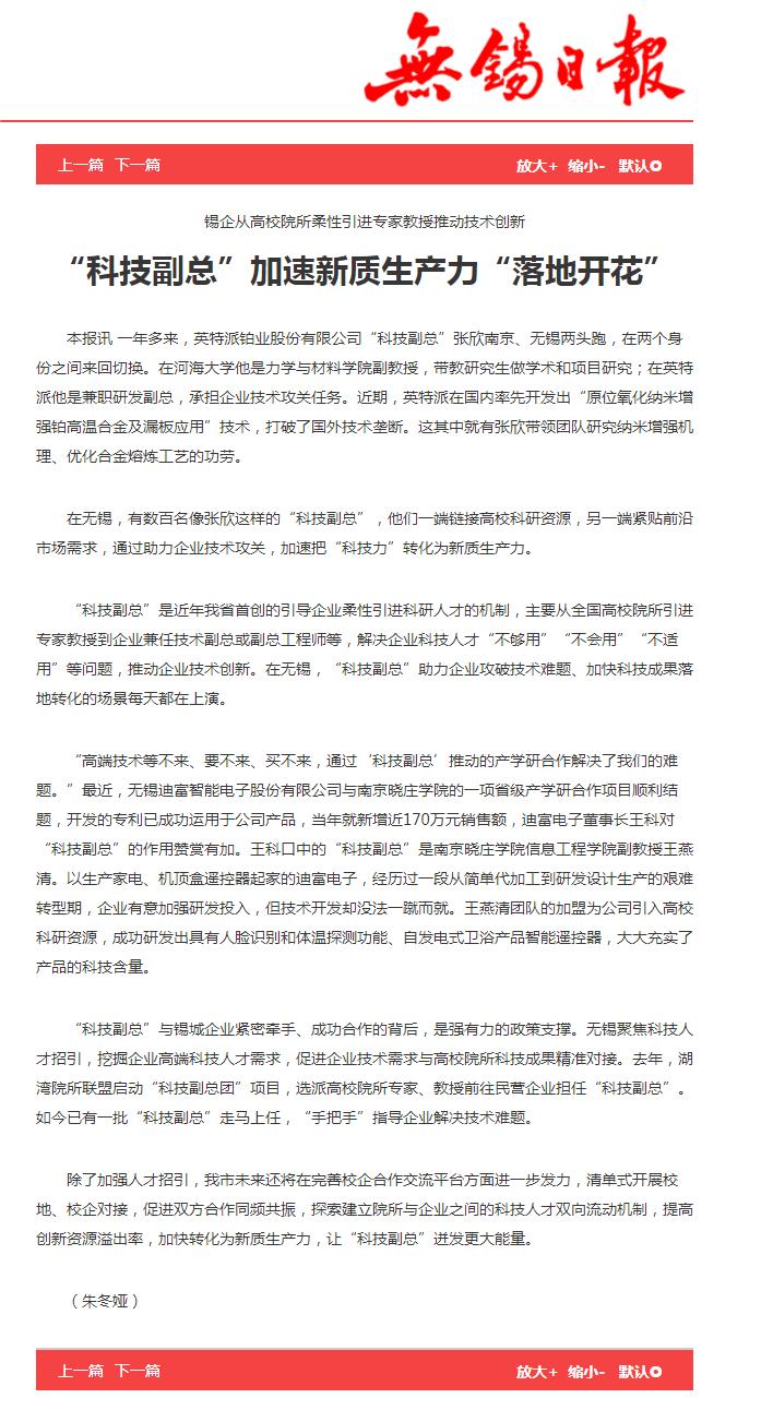 近日,《无锡日报》以《“科技副总”加速新质生产力“落地开花”》为题报道了我校信息工程学院王燕清教授助力企业技术攻关,加速把“科技力”转化为新质生产力的事迹。