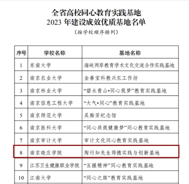 近日,江苏省委教育工委公布了全省高校同心教育实践基地2023年建设成效优质基地名单,经材料审核、实地察看、专家评审、网上公示等程序,我校同心教育实践基地“陶行知先生师德实践与创新基地”成功入选,本次全省共有20所高校入选。